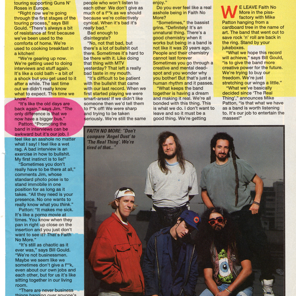 Patton: "It makes me sick. It's like a porno movie at times. You know when they pan in right up close on the insertion and you just don't want to see it? That's Faith- No More." "It's still as chaotic as it ever was," says Bill Gould. "We're not businessmen. Maybe we seem like we sometimes don't give a f**k, even about our own jobs and each other, but for us it's like sitting together in our living room.