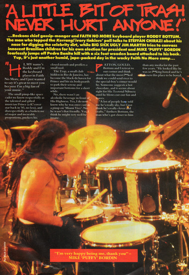 There's 95 degree humid heat and FNM are in Brazil to turn in their 110 degree performance at the Maracana Stadium. 'The Real Thing' has been out here for nearly three weeks and has already sold 10,000 copies. The Brazilian arm of PolyGram see this as an excuse to hire a small plane to circle Copacabana trailing a banner reading 'PolyGram welcomes Faith No More'; hospitable for sure but trying after a few hours.