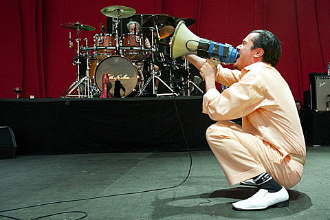The band came out dressed in different colored pastel suits. The two founding members, drummer Mike Bordin and bass player Bill Gould, (who started the band in 1981) and keyboardist Roddy Bottum (who joined in 1982) were joined by Jon Hudson, the most recent addition (he joined in 1997 to help with songwriting on "Album of the Year".) Mike Patton was the last to appear, and he came out slowly, walking with a cane. I wondered if there were going to be any Willy Wonka type antics, but after singing with the cane for a couple songs, he tossed it to the side of the stage. I couldn't tell if he was really hurt, but he did seem to move less than when he played with other bands in the last couple of years.