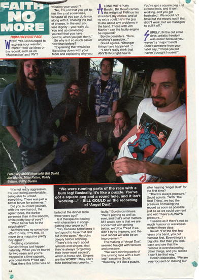 Have you noticed how much more a part of FNM Mike Patton has now become? Patton's development seems to have escaped press probings. The piss-drinking, the tampon-munching, the lurches, the screams, the insults, the jokes, the lyrics, the dark side of 1989s pin-up. He has become the definition for mischievous, curious and warped youths worldwide, a man who will try anything just for, the hell of it. But the biggest strides Patton made were in actually becoming a happy member of Faith No More. When did this penny drop?