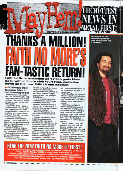 FAITH NO MORE are set to announce details of their forthcoming UK tour! And Kerrang! can reveal that the band's first Brit dates since the 1993 Phoenix Festival will be the ultimate in 'Intimate', with nearly all shows to take place at venues with less than 1,000 capacity!
