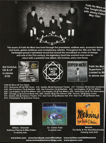 Like the unconquered sun. Faith No More will once again fan across the globe in support of Sol Invictus. The year-long tour will thankfully include dates across middle America, and will also include a significant portion of the new album in its set lists. Because, as Patton notes, they didn't work their asses off on Sol Invictus just so they could go out and play "the hits" again.