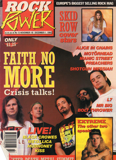 Now that Faith No More are touring the States in their own right, they've been reduced to 16mm. They have, however, acquired an extra tour bus and some new, more expensive, toys. Bill, for example, has just bought himself a Kurzweil 2000 keyboard, which has an impressive array of pre-set sounds like Doomsday, Alien Factory and Rainforest Crunch. The bassist is only sorry that he didn't have the keyboard during the tedious GN'R tour